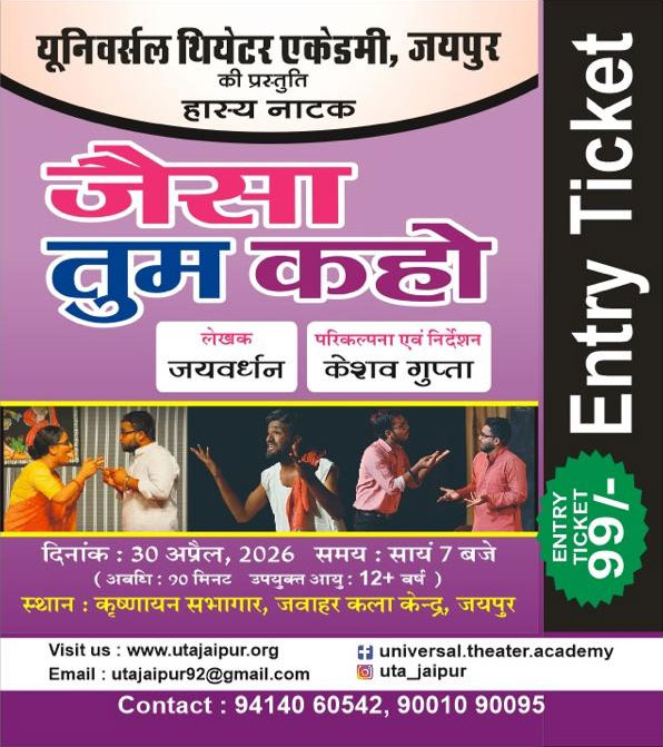 Universal Theatre Academy is established on 17th november 1992, initially the academy used to work in a school called Subodh Vidya Mandir along with academics the academy used to operate cultural programmes too. Since October 2015 the academy is actively working in the theatre world. In the last years the academy has done plays like BABY TUM NADAN, SINHASAN KHALI HAI, O MERE SAPNE, & KAYA ME KAYA in the direction of academy director KESHAV GUPTA in an exciting order in jaipur as well as in many other cities of rajasthan, apart from these the academy has successful shows in its kitty of various plays like SUHAGRAAT, MAUT KE SAYE ME, NANI BAI RO MAYRO.