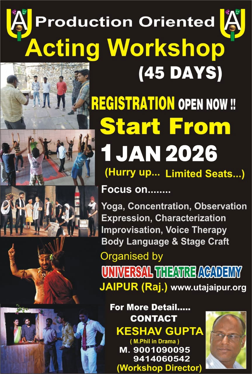 Universal Theatre Academy is established on 17th november 1992, initially the academy used to work in a school called Subodh Vidya Mandir along with academics the academy used to operate cultural programmes too. Since October 2015 the academy is actively working in the theatre world. In the last years the academy has done plays like BABY TUM NADAN, SINHASAN KHALI HAI, O MERE SAPNE, & KAYA ME KAYA in the direction of academy director KESHAV GUPTA in an exciting order in jaipur as well as in many other cities of rajasthan, apart from these the academy has successful shows in its kitty of various plays like SUHAGRAAT, MAUT KE SAYE ME, NANI BAI RO MAYRO.